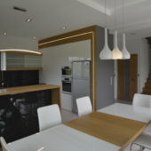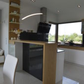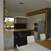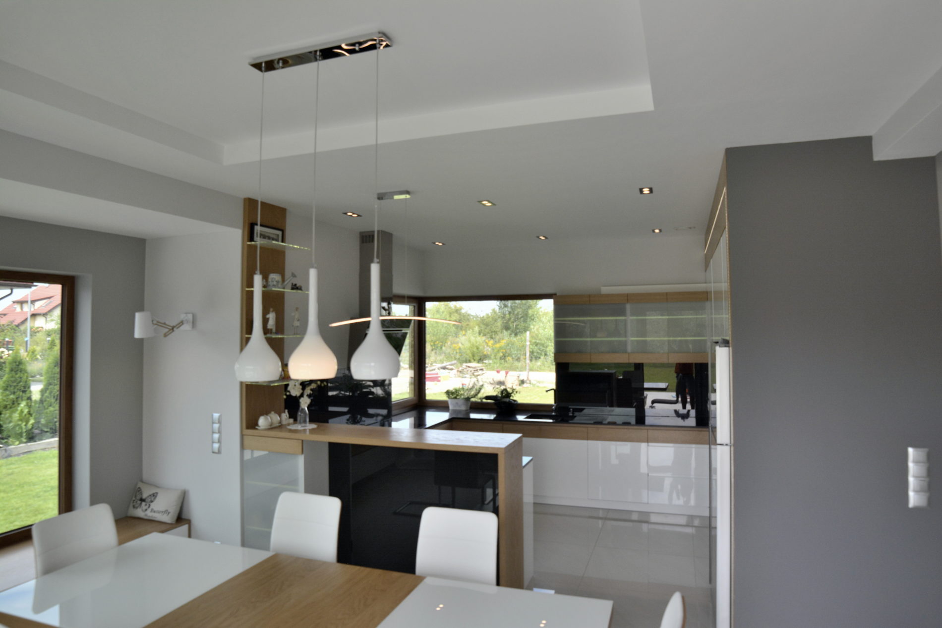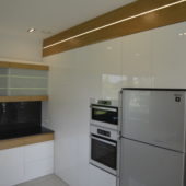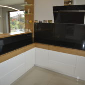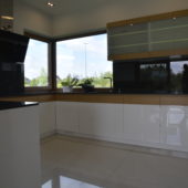 Meble kuchenne, połączenie bieli w połysku z naturalnym pięknem dębu. Blat kuchenny z kamienia .